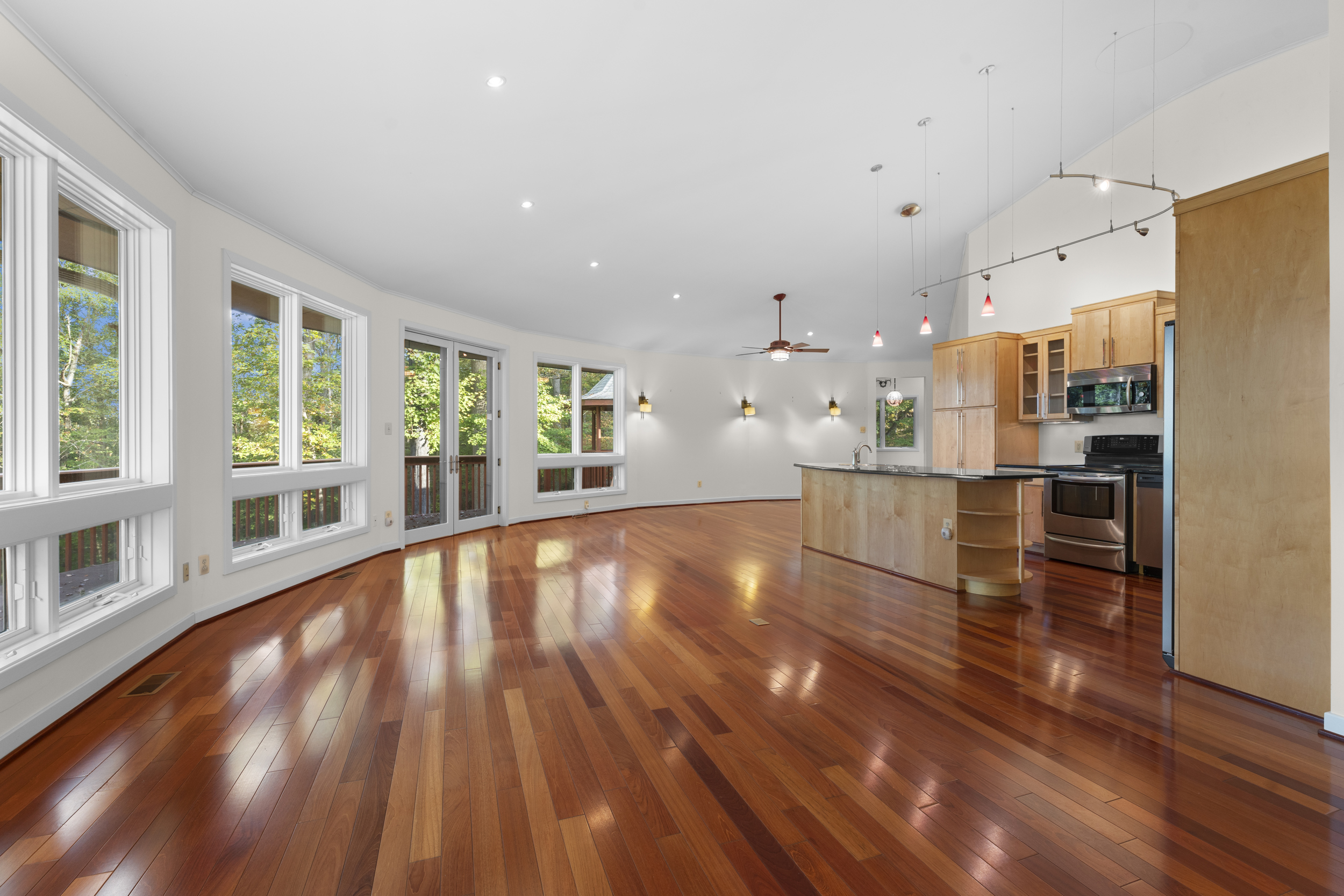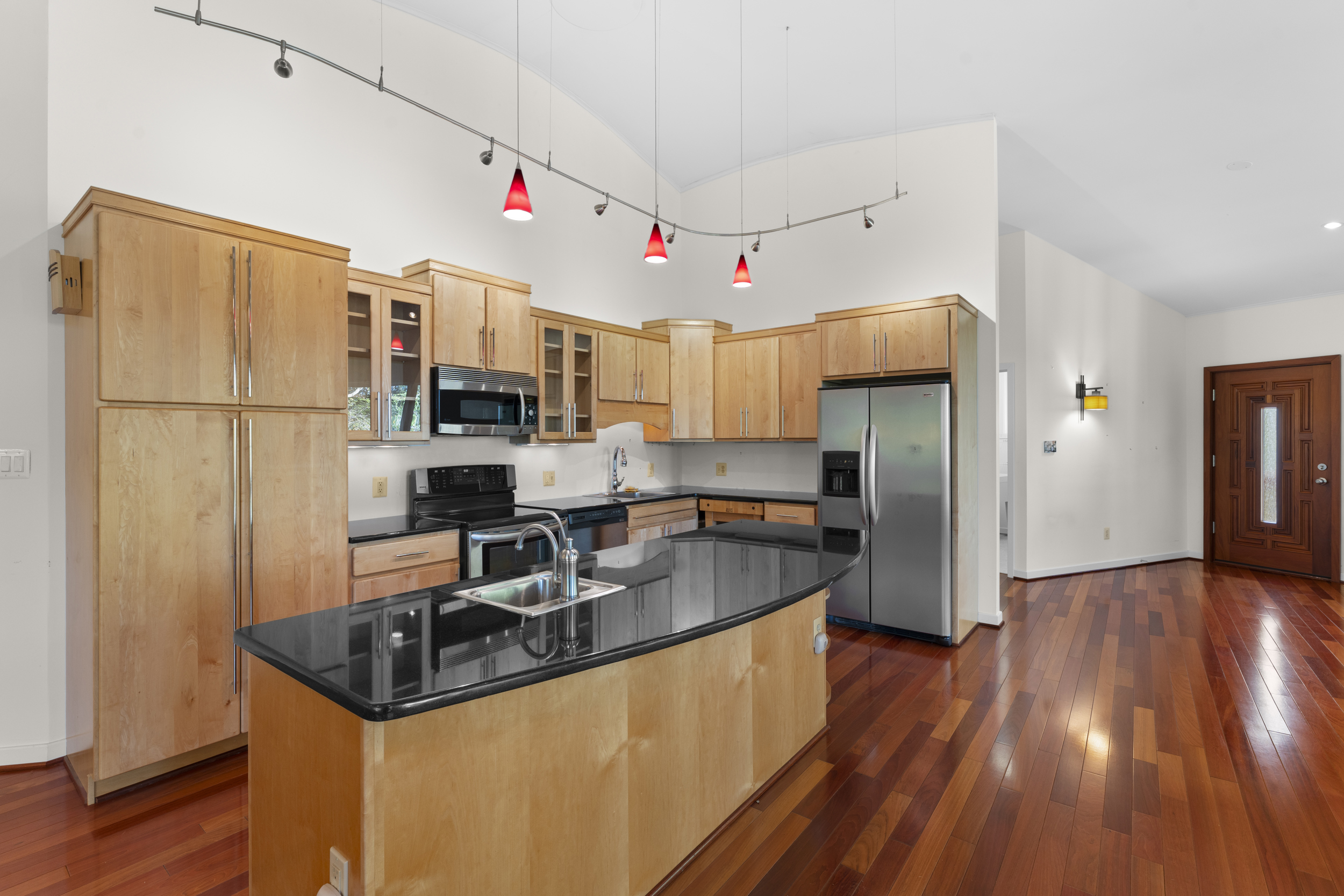 When it is finally time to go indoors, the wide-open great room greets arrivals with a long, curving wall of windows. The outdoors, sunlight and leaves shifting in the breeze, feel like they are part of the indoors here. The space is a gleaming expanse of cherry hardwood floors, designer lighting, high ceilings, and oversized windows. The centerpiece of the great room is the gourmet kitchen. Literally at the heart of the home, the kitchen is strategically placed and designed to allow gathering while not impeding the cook. To one side is the open expanse of living area while to the other is the equally open dining area.