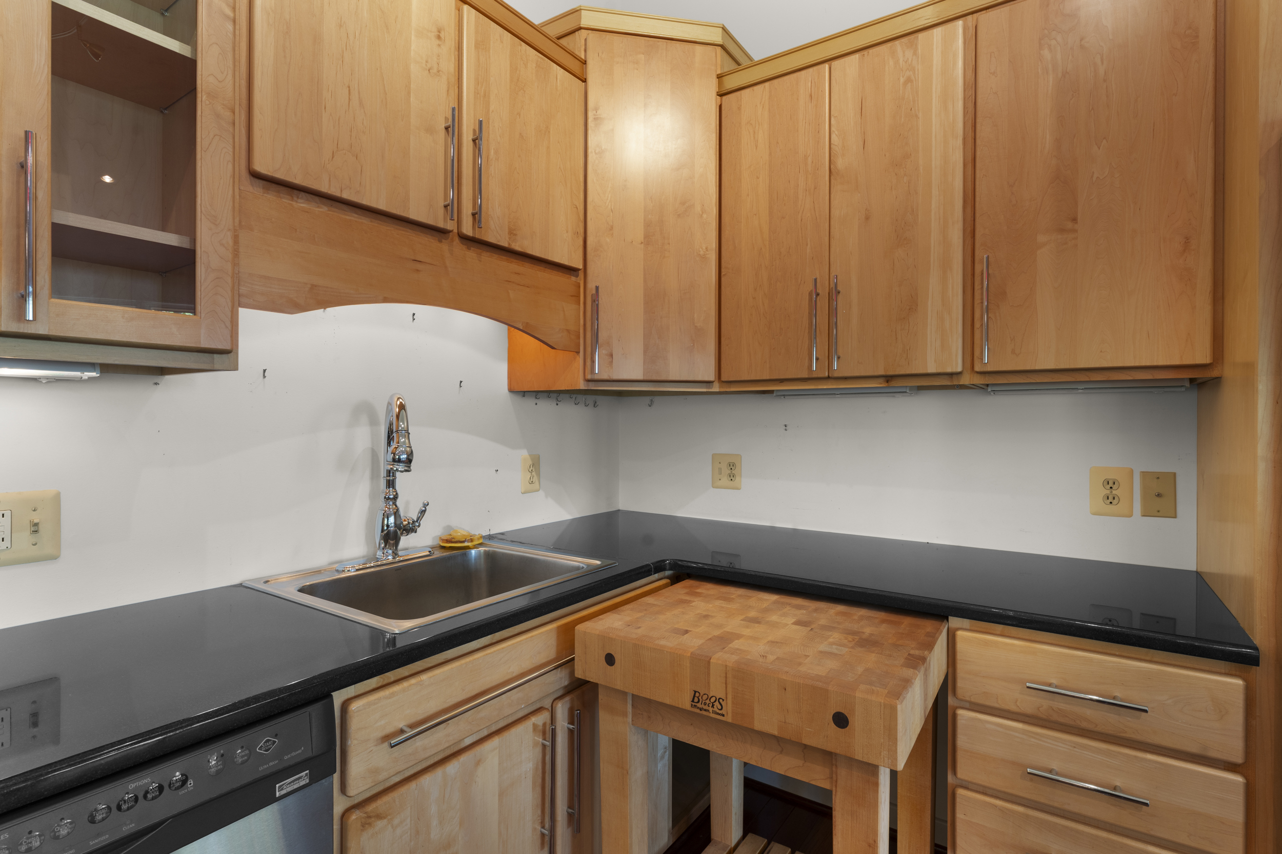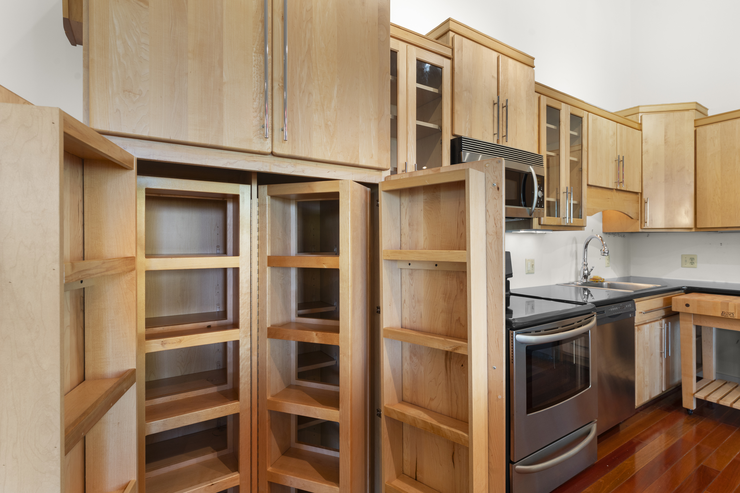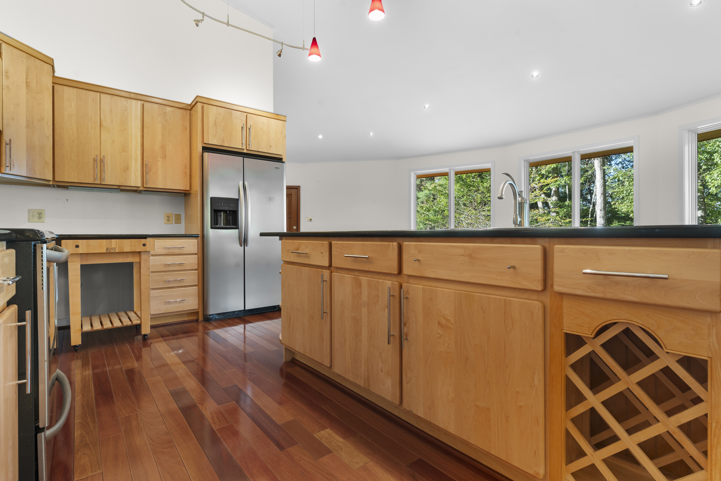 The kitchen has a custom designed layout of maple cabinets with all the bells and whistles, stainless steel appliances, and ample granite counters. The large island has a separate prep sink, built in wine rack, cabinets with pull-out trays and pull-out trash bins, and space for bar stools on the other side. Next to the main sink is a clever butcher block on wheels that tucks under the counter when not in use. The built in pantry is a marvel of accessible storage.