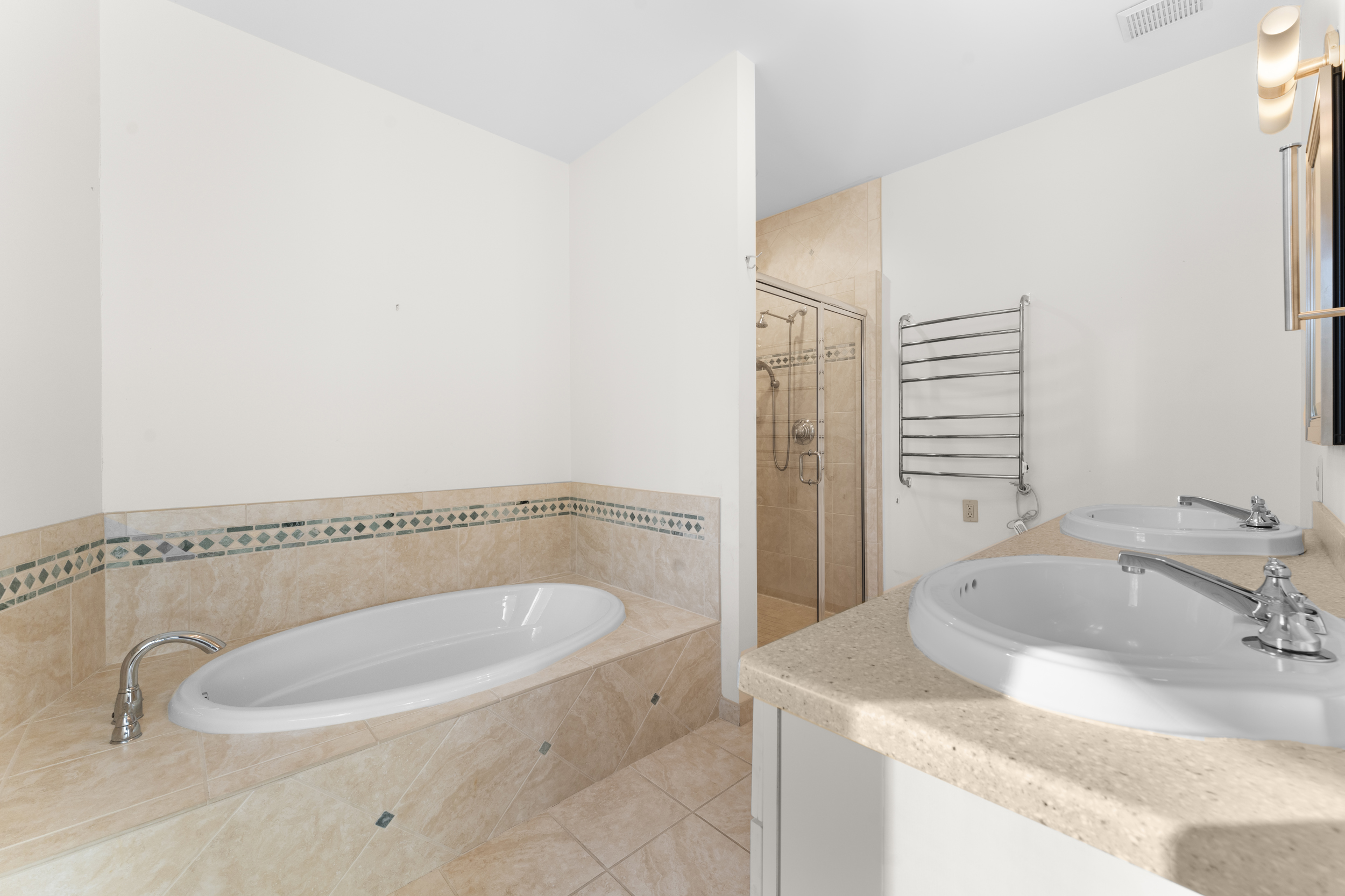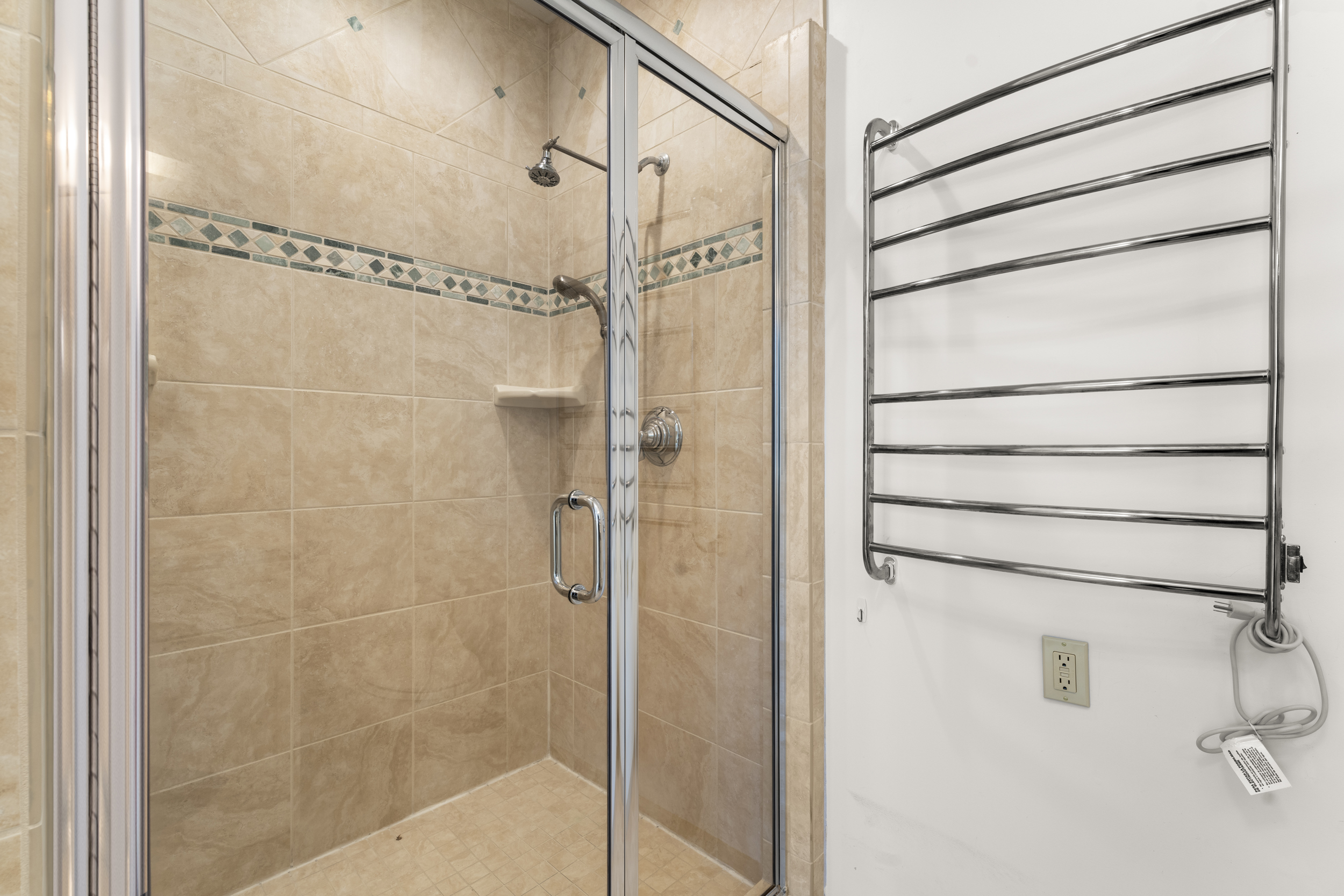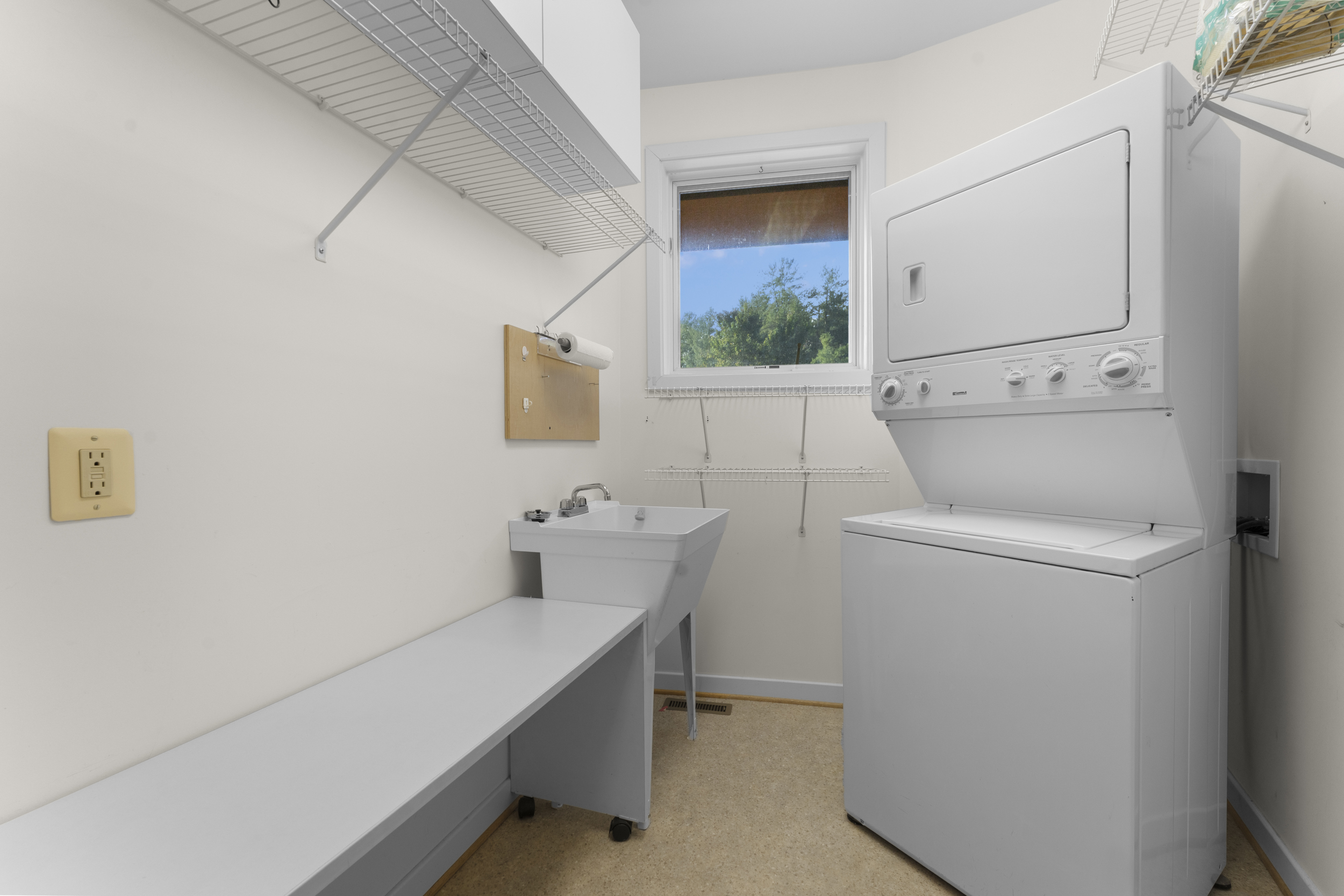 Just beyond the kitchen and dining area is a bright and airy bonus room with a glass sliding door to the deck and a cathedral ceiling. This flexible space would lend itself to use as a media room, office, library, overflow guest room, or all four. There are several built in book shelves and a handy work surface. Continuing around the circle, the primary bedroom is tucked behind the kitchen. It features a fully cedar-lined walk-in closet and a beautifully tiled, inviting ensuite bath. There is a separate soaking tub, walk-in shower, double sinks, and a heated towel rack for that extra feeling of luxury. On the other side of the kitchen, the private second bedroom is down a short hallway that contains the second bath. This bath repeats the beautiful tile work, complete with river stone inlay and luxurious heated towel rack. Next door to this bath is the convenient main floor laundry.