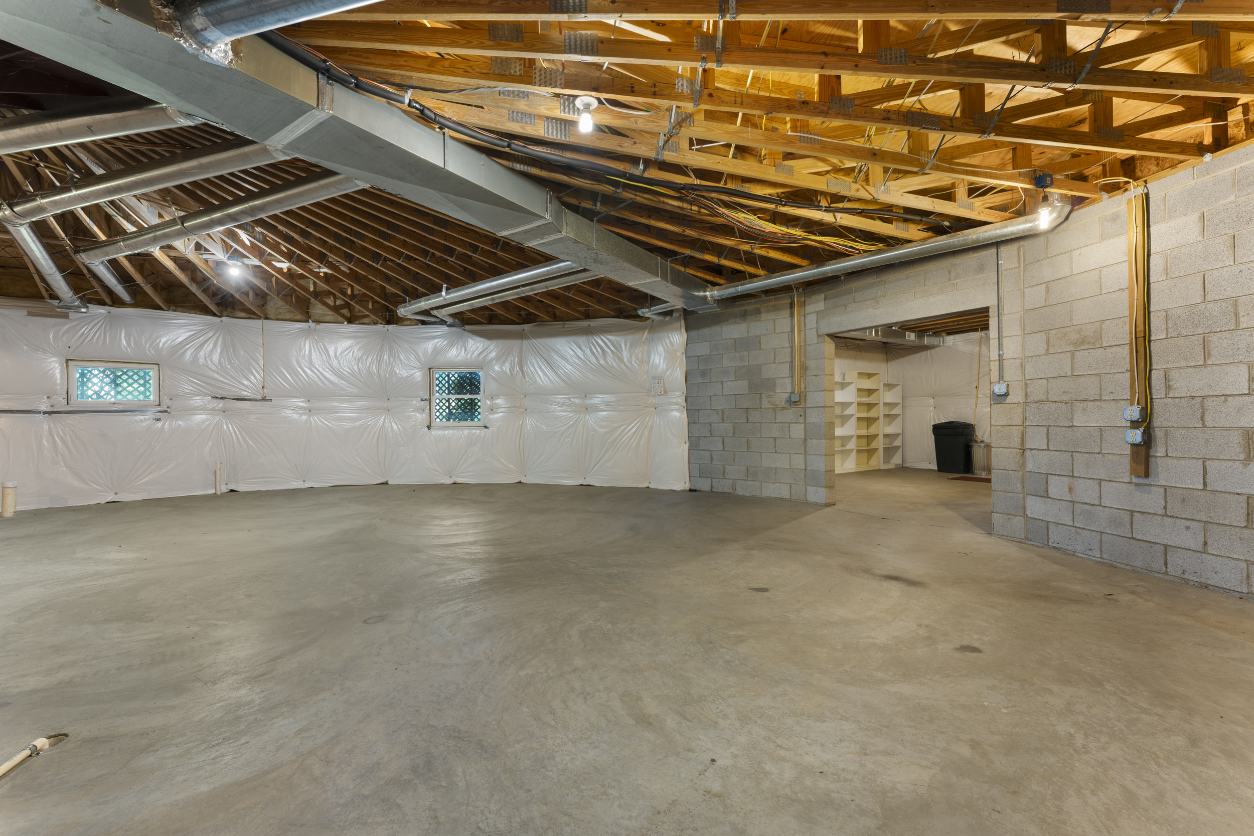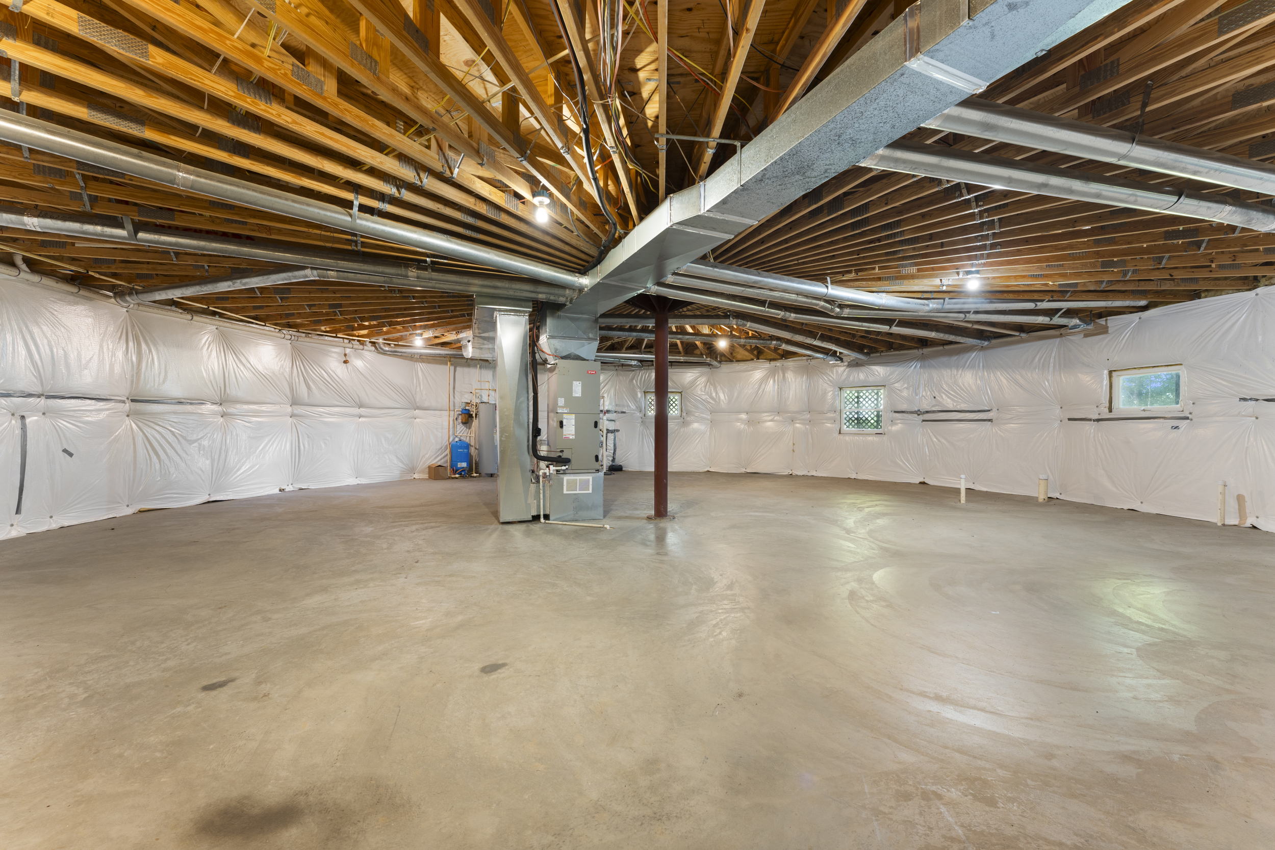 The full basement is reached by stairs in the bonus room and also has an on-grade door to the outside. It is a blank canvas waiting for inspiration. Ductwork is already installed as well as roughed-in plumbing for a full bath plus an extra sink. Perhaps a future wet bar or an art room? The septic system is sized and permitted for three bedrooms, so one could be added on this level. The high ceiling reveals the secret to the round construction: a steel central support post with all floor joists meeting in the center like spokes on a wheel. The circular design provides not only unmatched structural strength but also energy efficiency.