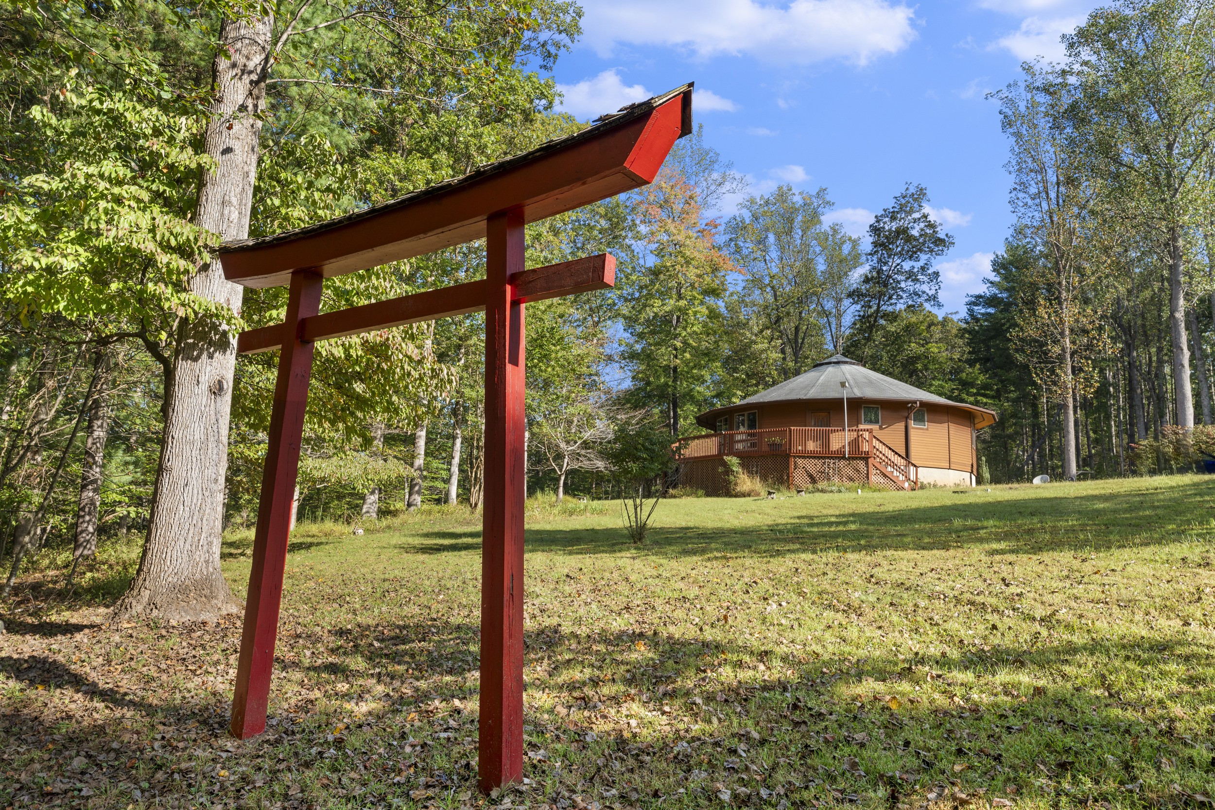 Turning back towards the front door, a flash of red at the edge of the woods catches the eye. This is the Torii gate, leading to the hidden, circular meditation pond. Spring fed, the cool, clear water of the pond is home to native frogs, newts, and others. What a delightful, serene spot to sit, breathe, and release the stresses of the day.